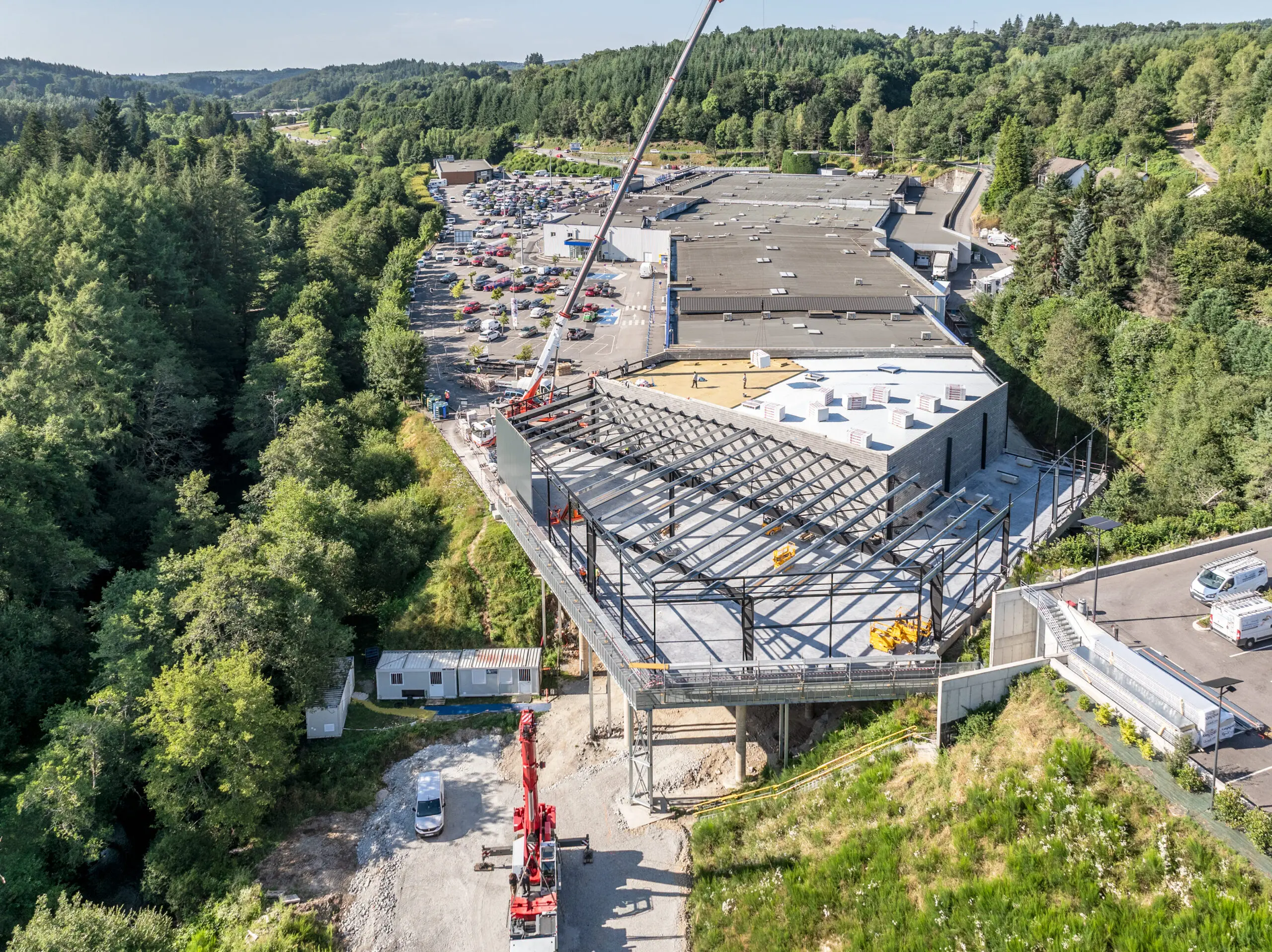 Dans le cadre de l’extension des cellules commerciales, de la création d’un DRIVE et du re modeling des façades, plus de 130 tonnes de charpente métallique ont été calculées, dessinées et fabriquées dans les ateliers de Gibard.